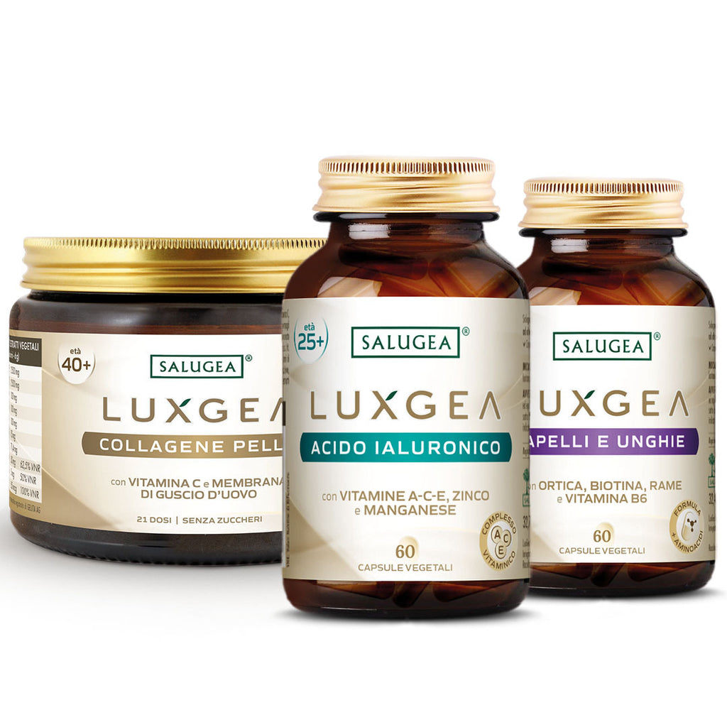 Al centro di questo percorso ci sono tre integratori complementari, sviluppati dalla ricerca scientifica Salugea per agire in modo mirato su più livelli: LuxGea Collagene Pelle, LuxGea Acido Ialuronico e LuxGea Capelli e Unghie.