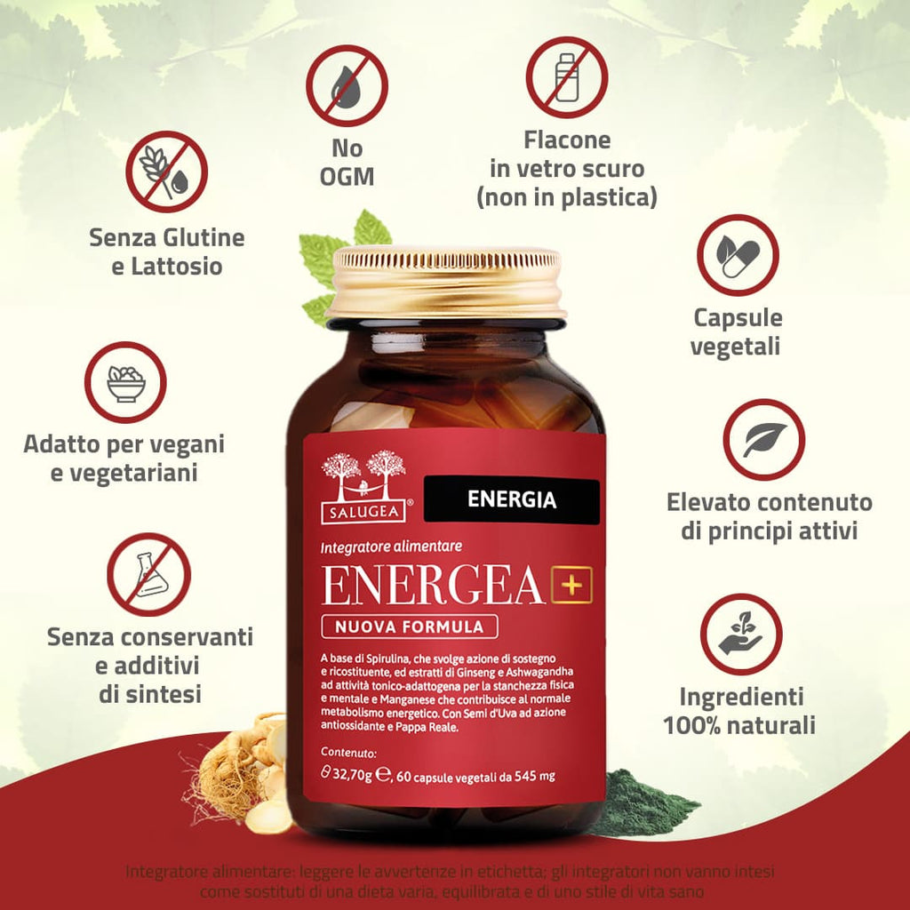 Energea+ Nuova Formula di Salugea è l’integratore che, grazie ai suoi attivi innovativi, aiuta il tuo organismo a produrre nuova energia.