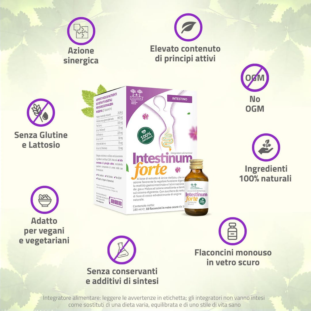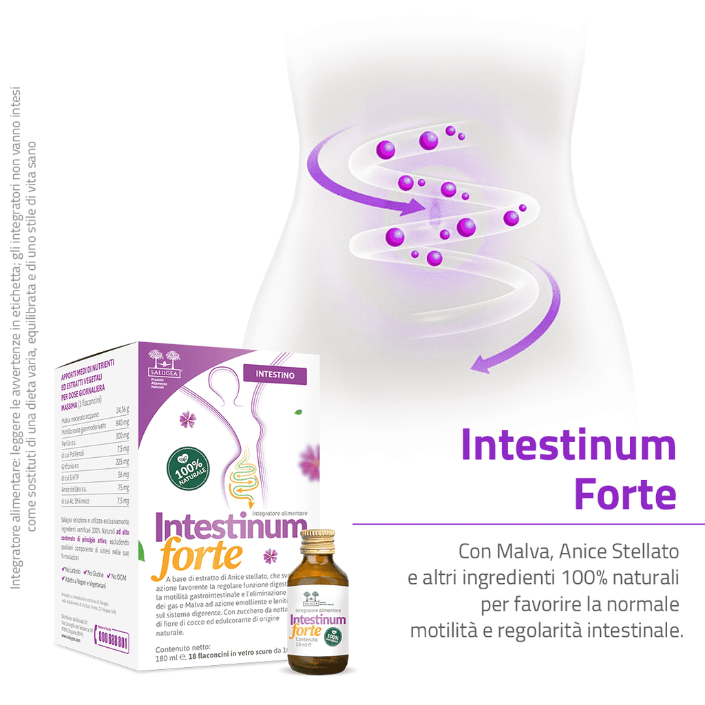 Il segreto di Intestinum Forte è tutto nella sua formulazione (totalmente naturale) in cui ogni attivo agisce in sinergia per favorire l’equilibrio intestinale, in particolare la motilità ed il benessere della sua mucosa, e sostenere il tono dell’umore.