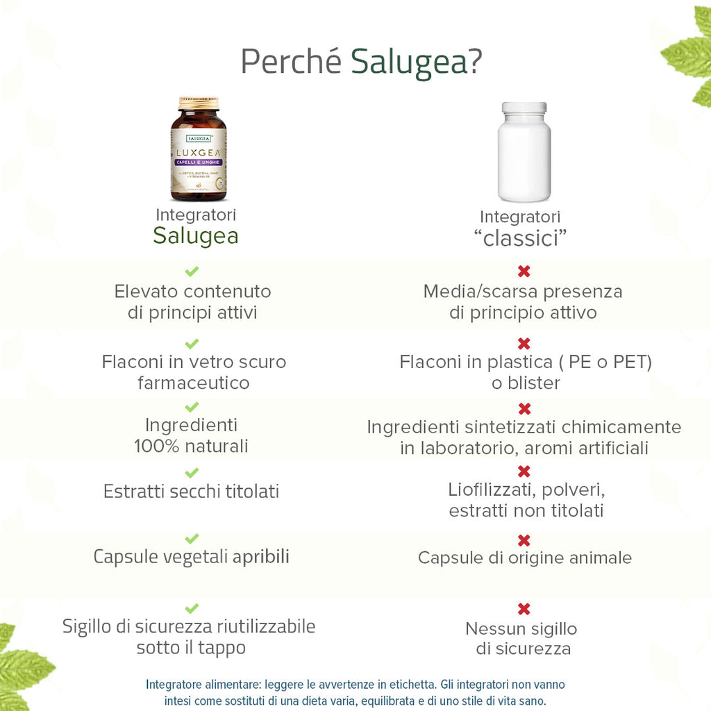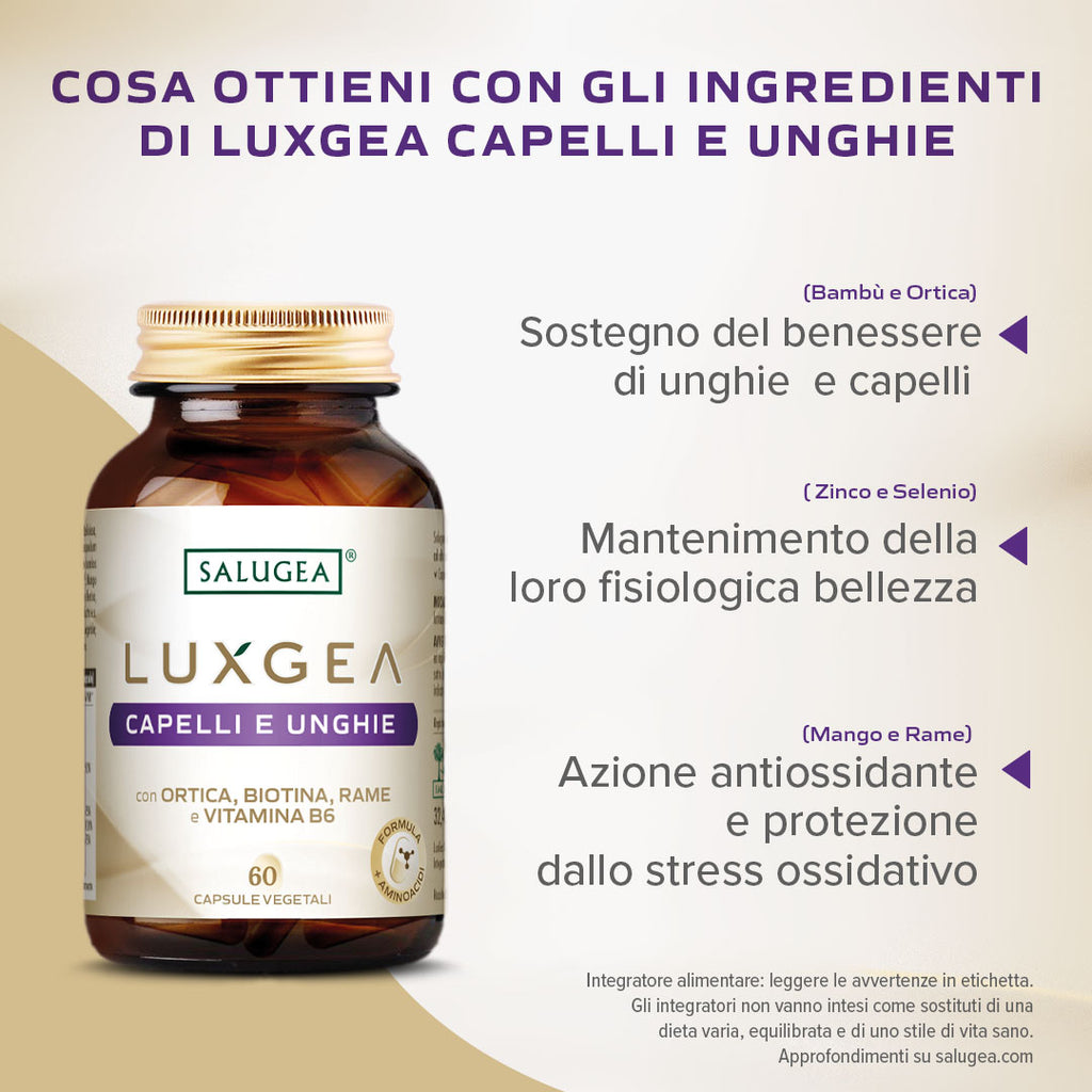 Luxgea Capelli e Unghie è l’integratore Salugea con formula 100% naturale per il benessere di capelli e unghie.