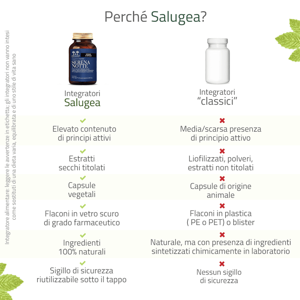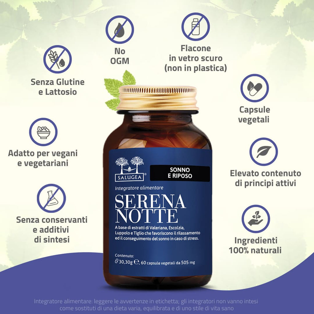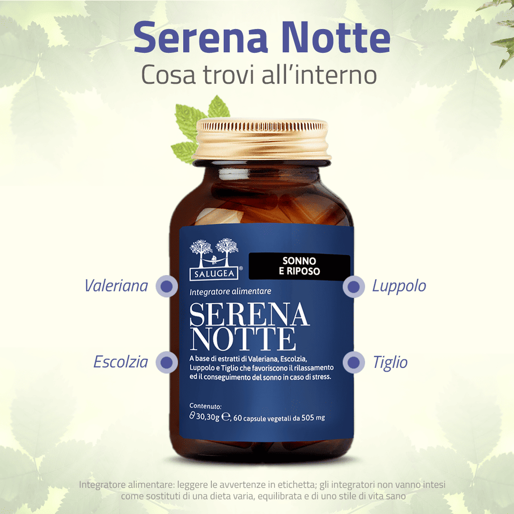 Serena Notte è l’integratore100% naturale di Salugea che aiuta a dormire bene, perché favorisce un sonno profondo e duraturo, senza creare dipendenza e senza melatonina.